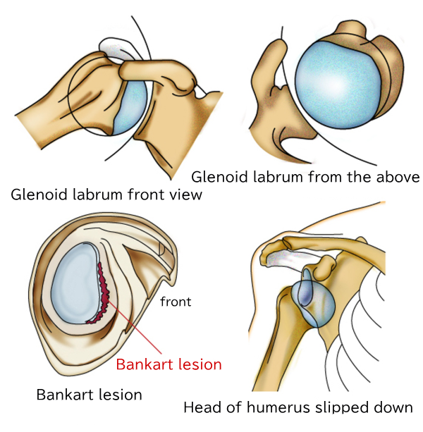 反復性肩関節脱臼の方の病態は、関節窩という上腕骨の受け皿につく靭帯がはがれるバンカート損傷というものが生じます。普段の肩は靭帯が緊張して、肩が受け皿からはこぼれおちない(脱臼しない)ように働きますが、バンカート損傷が生じると靭帯は緊張しなくなります。