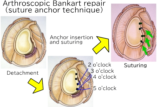 The above illustration depicts the arthroscopic Bankart procedure. Four anchors are inserted after detaching the ligament. The threads attached to the anchors are passed through the ligament to suture it.