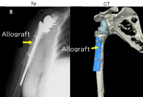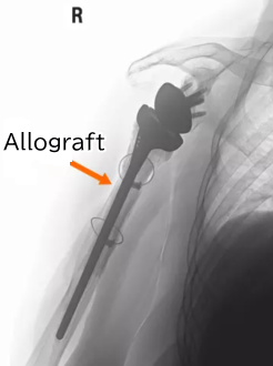 The allograft remains fixed to the humerus even after 3 years, and the stem is firmly secured within the humerus.