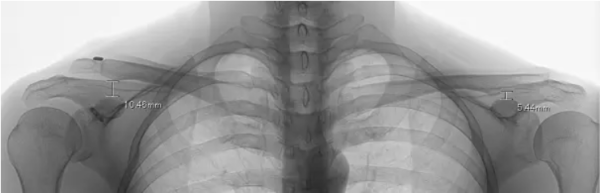 This patient underwent coracoclavicular ligament reconstruction and has been followed for 10 years. Postoperatively, displacement of the right acromioclavicular joint has been observed; however, the degree of displacement is less than it was before surgery.