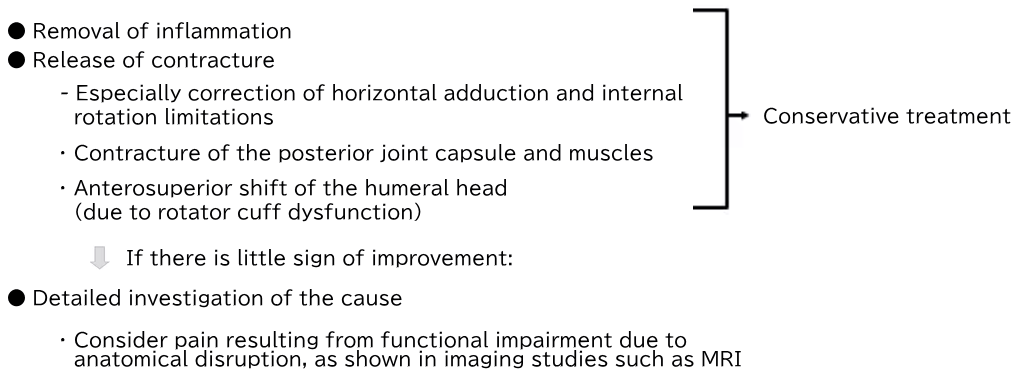 Pathologically, ongoing inflammation leads to contracture caused by decreased extensibility of the rotator cuff muscles, and physical therapy is the first-line treatment.