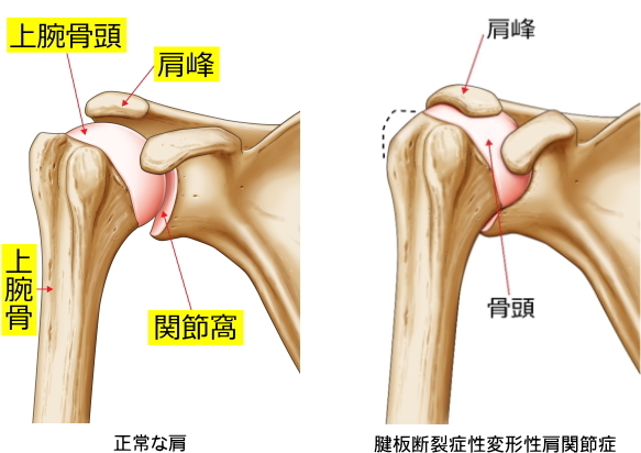 腱板が広範囲に断裂して、上腕骨と肩峰のすきまが小さくなります。腱板機能が低下し、上腕骨の変形がすすんだ病気です。